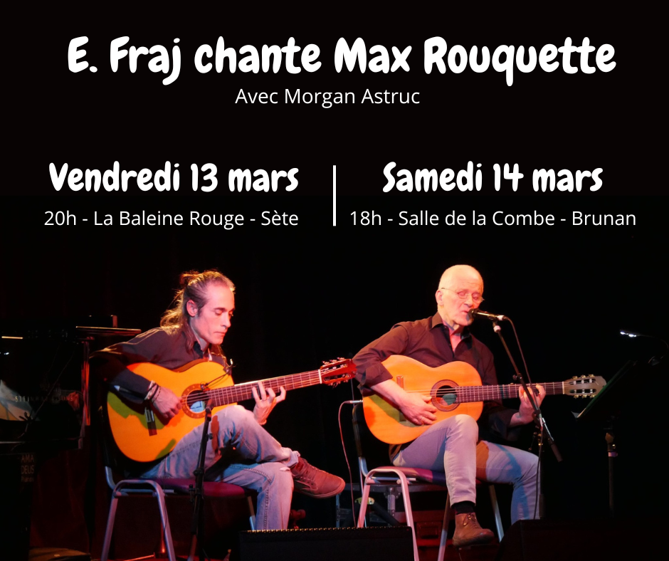 Morgan et moi continuons sur la route des concerts où nous présenterons le concert E. Fraj chante Max Rouquette à Saint-Guilhem le Désert, salle de la Combe de Brunan à 18h00. Que du bonheur ! Coneguda causa siá!