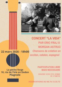 Après les montagnes, retour dans la plaine commingeoise, à Plagnole, où nous donnerons le concert LA VIDA, à la Petite Forge, un lieu très sympathique et accueillant, au 10 route de l’Isle-en-Dodon, le 22 mars à 18h. Le concert sera suivi d’un verre de l’amitié.